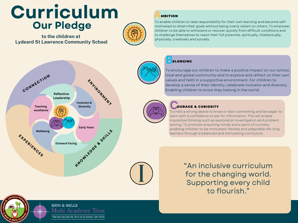 The learning journey at Lydeard St Lawrence will support children's sense of identity and shows them what it means to be a human being in this ever-changing world. Lydeard St Lawrence is determined that all children in our school will have the opportunity to access an ambitious curriculum to guide them to make progress from their starting points and equip each child with the skills they need for their personal learning journey.