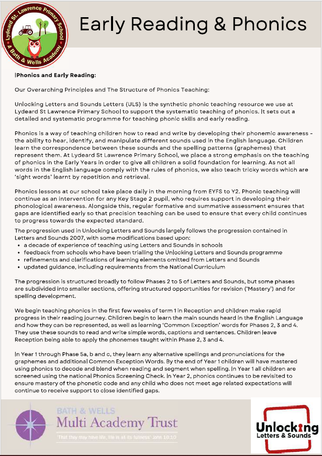 At Lydeard St Lawrence School we promote a 'phonics first' approach and in both our guided reading sessions at school and in the books children take home, texts are very closely matched to a child's current phonics knowledge so that every child can experience real success in their reading. In these crucial early stages of reading we primarily use books from Ransom Reading Stars Phonics, to ensure complete fidelity to the Unlocking Letters and Sounds progression we follow.
